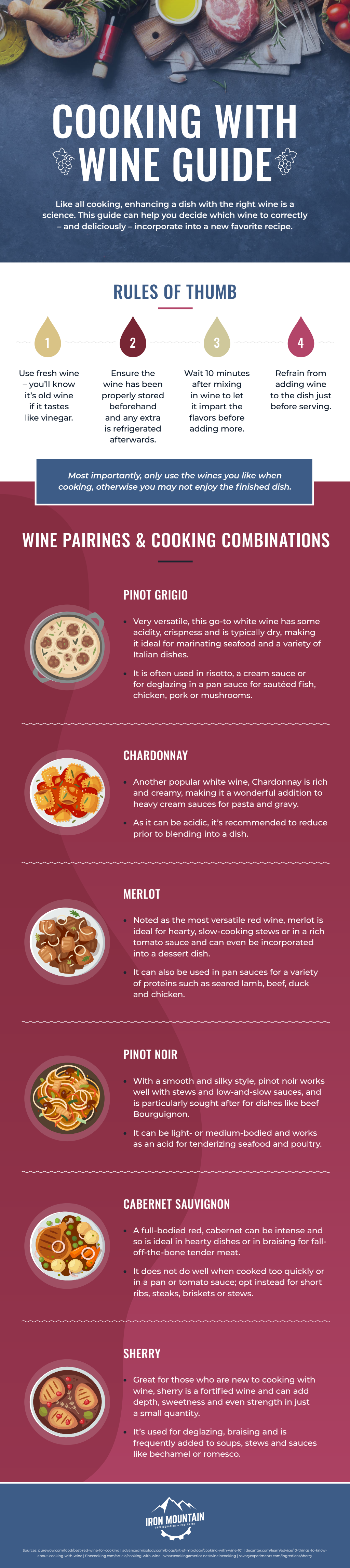 Of course, there aren’t any hard rules, so feel free to experiment. When just starting out, opt for the more versatile types, such as merlot for red and pinot grigio for white. These are simpler than some of the other varieties and may be easier to pair with the meal. For further pointers on cooking with wine, please see the accompanying resource from Iron Mountain, a commercial refrigeration distributor.